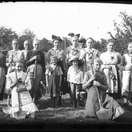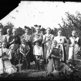 Stav: škrábanec Poznámka: olepeno izolační páskou Opis ze staré obálky: Záběr: Hromadná fotografie mladých hochů a děvčat při domu p. řid. Brdy; B.