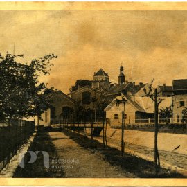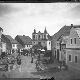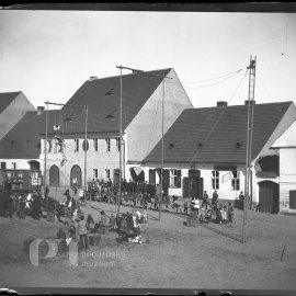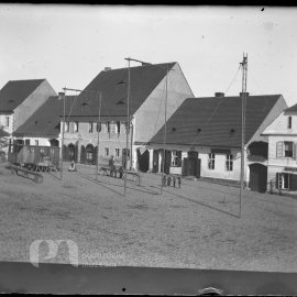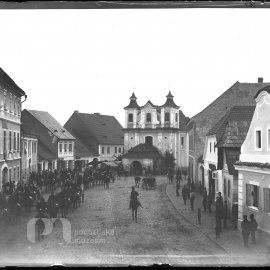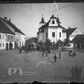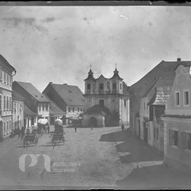 Stav: poměrně pěkný negativ Poznámka: vyryto č.267 Opis ze staré obálky: Dělostřelci na náměstí I. 9. 8. 1893; (starý kostel, měšť. škola nestála, staré budovy atd); Z - moment B - autol, dělostřelci…
