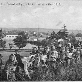 Školní dítky na trhání lnu za války 1916