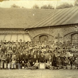 Stav: mírně poškozené Poznámka: Vedoucí slévárny Syrovátka č. 1, napravo Horák, nalevo Pražák. 2 slevač Blažek z Voltuše. Zadní řada: 3. Karel Roj, 9. Matějka, 14. Šimon Stránský Vranovice. Druhá ř.…