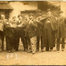 Stav: horší, ohnutý roh, degradace foto vrstvy Poznámka: Na dvoře Slavie kolem 1895, 2 starý Zíka, 3 hostinský Prada, Žanda, 4 Velek truhlář, 5 mistr slévač Petrovic, 7 Koutský, 9 majitel mlýna Báca.