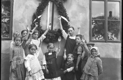 Opis ze staré obálky: Václav Matoušek: negativy 4,5x6 cm partie z města i z lesa, les. bouda, St. Rožmitál - kostel 1933; Starý Rožmitál různé