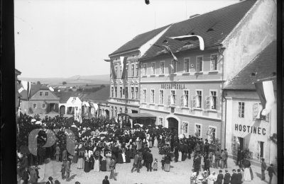 Opis ze staré obálky: Václav Matoušek: negativy 4,5x6 cm partie z města i z lesa, les. bouda, St. Rožmitál - kostel 1933; Starý Rožmitál různé