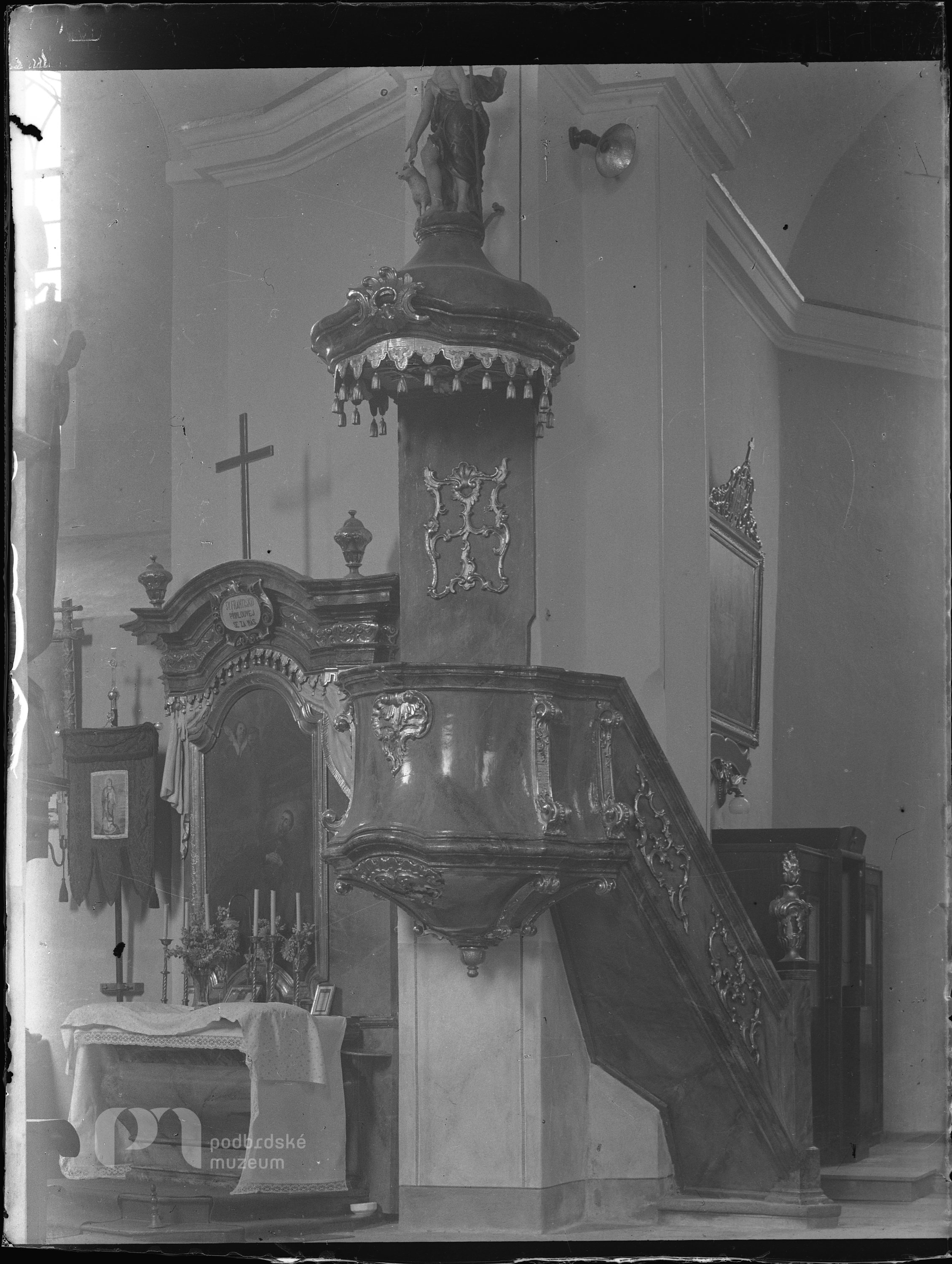 Opis ze staré obálky: Václav Matoušek: negativy 4,5x6 cm partie z města i z lesa, les. bouda, St. Rožmitál - kostel 1933; Starý Rožmitál různé; 1933 Kostel po požáru ve St. Rožmitále vnitřek kostela