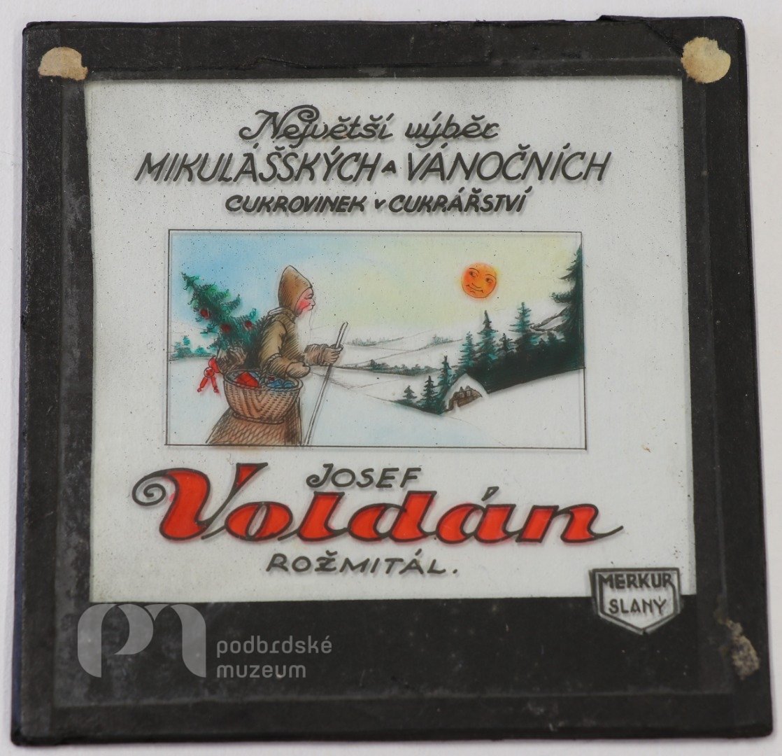 Poznámka: jedna reklama prasklá, vyrobila firma Merkur Slaný, text: Navštivte cukrářství a Největší výběr Mikulášských a Vánočních cukrovinek v cukrářství