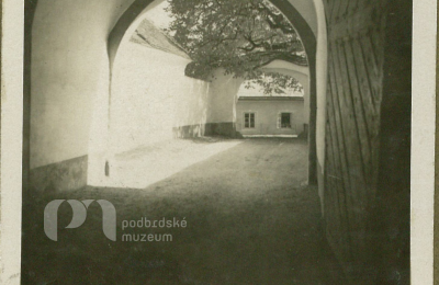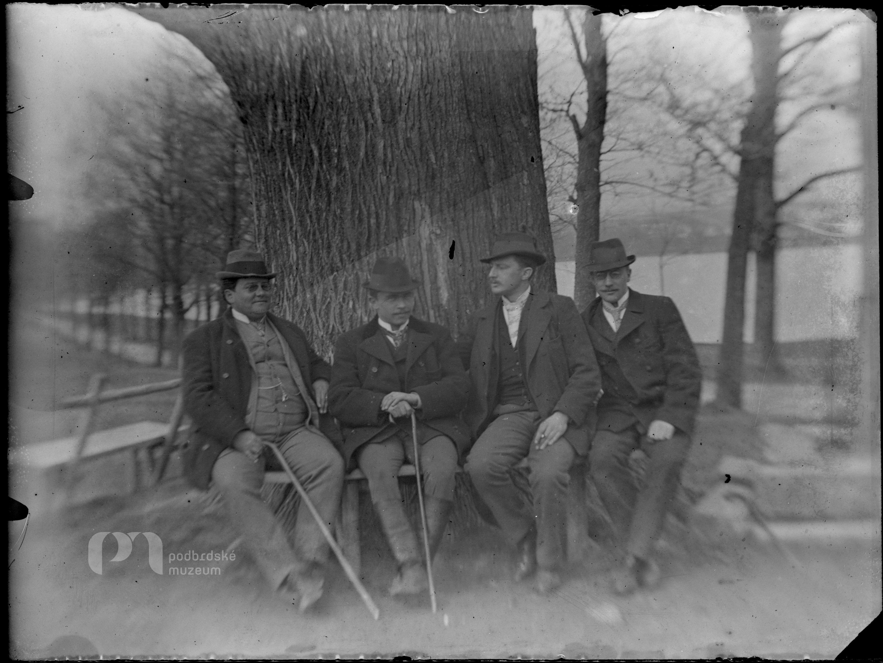 Opis ze staré obálky: Sedící skupina u lípy Podzámeckého dvora, u aleje; (arcib. zaměstnanci)