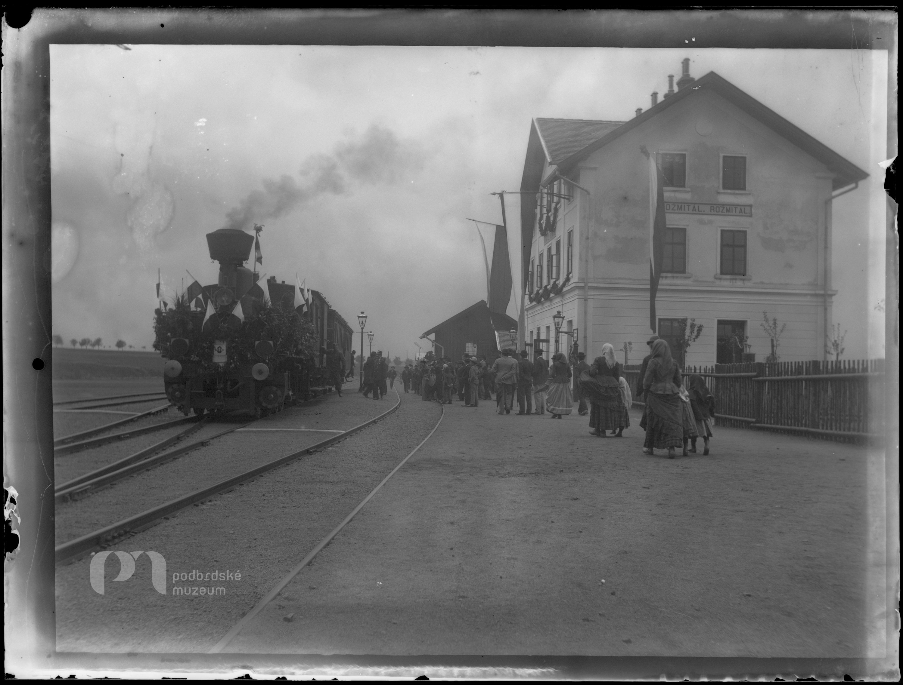 Opis ze staré obálky: První vlak v Rožmitálské stanici; 2 snímky rozdílné; 20. VI. 1899