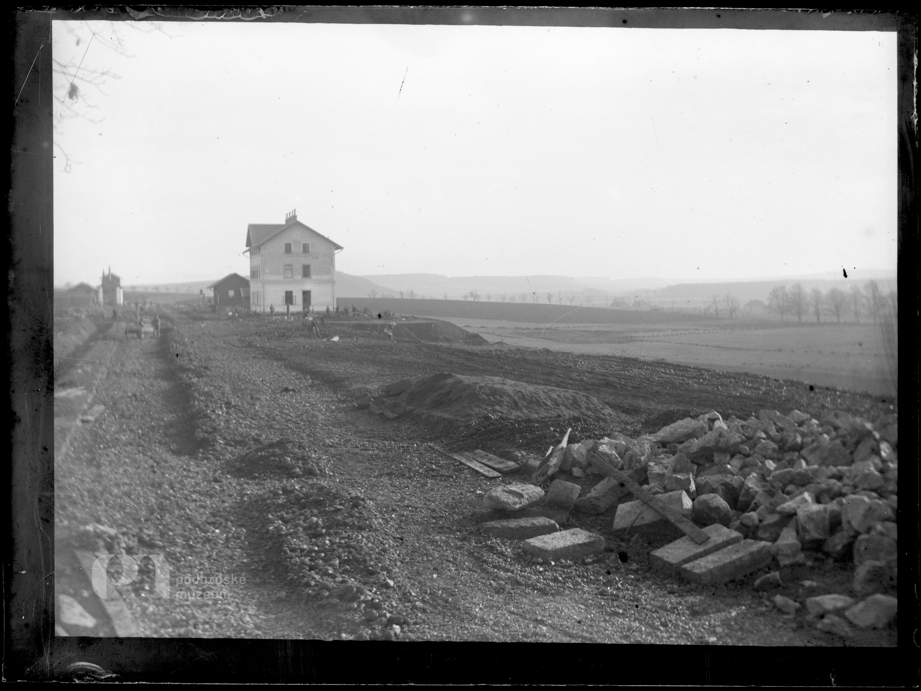 Opis ze staré obálky: První vlak v Rožmitálské stanici; 2 snímky rozdílné; 20. VI. 1899