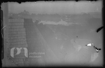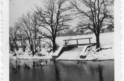 Opis ze staré obálky: 1) Sobenský mlýn; 2) Hráz Soben. rybníka; Povodeň 1895; Kolo odplavené daleko od mlýna; třeba je retuš, vzácný snímek!; Hráz Kotel. rybníka?