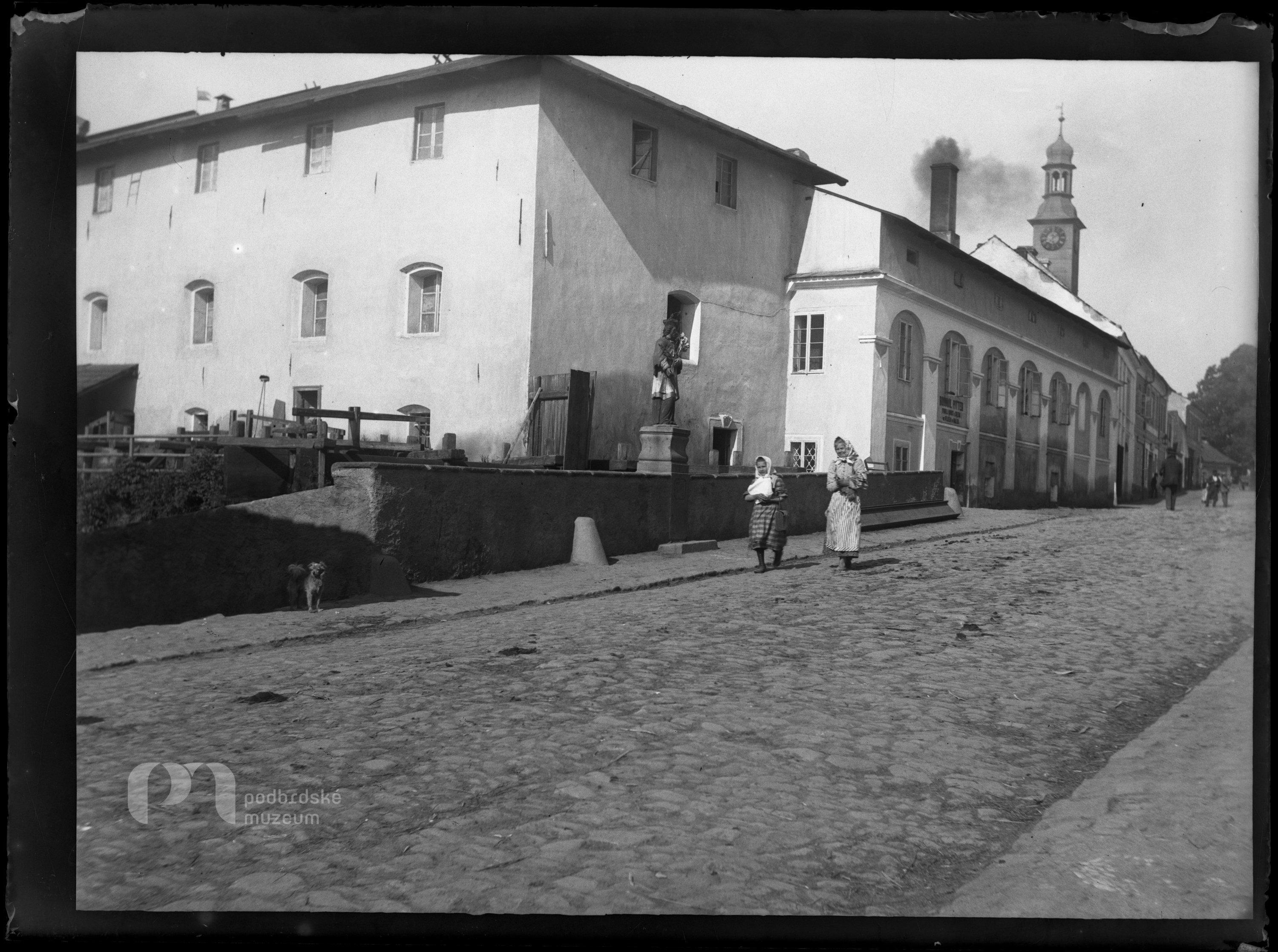 Opis ze staré obálky: Mlýn Podbranský; cenný snímek; (Boh. Pitter nájemce mlýna asi 1898)