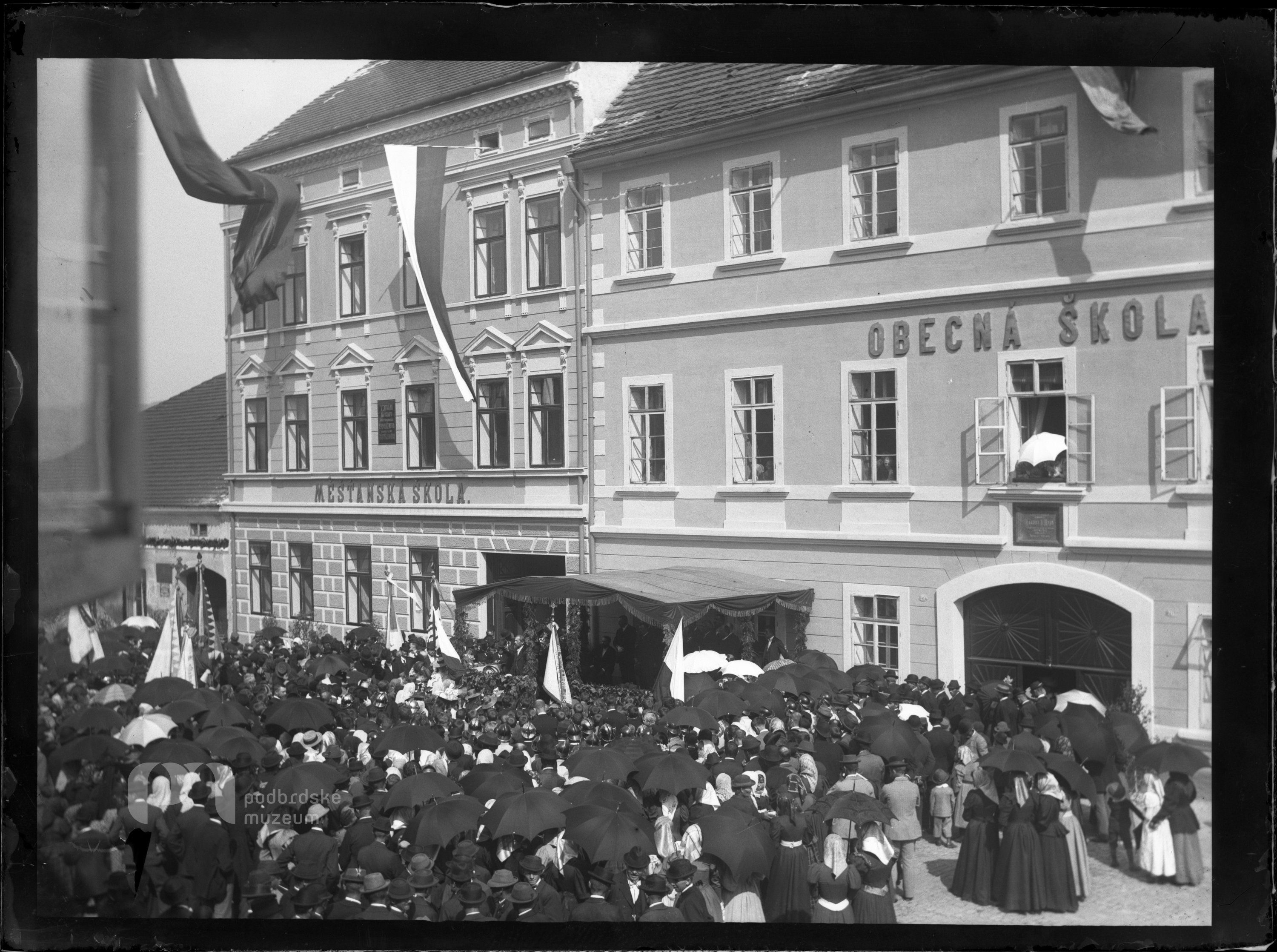 Opis ze staré obálky: slavnostní svěcení školy měšťanské v Rožmitále; 3 KS
