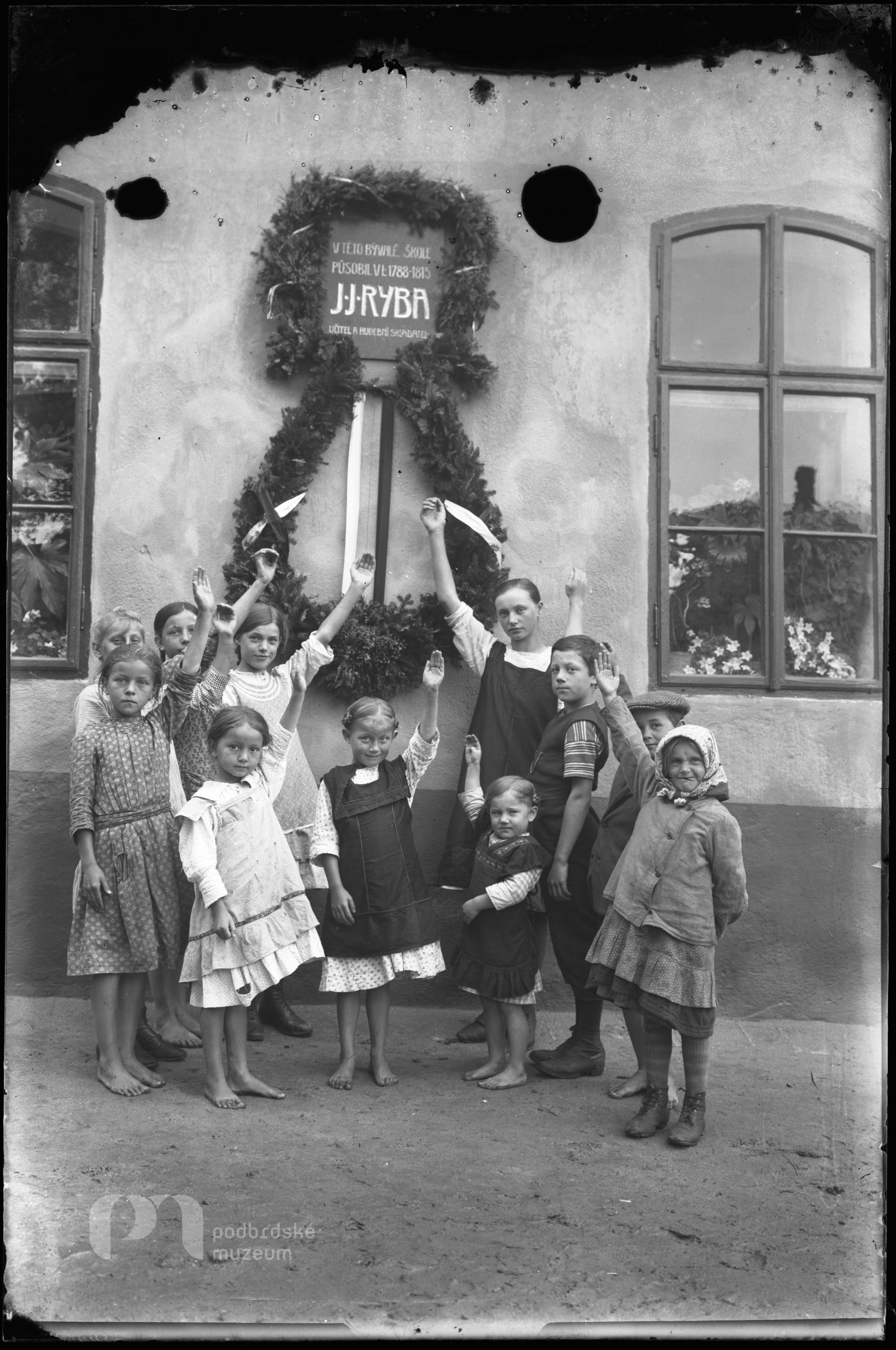 Opis ze staré obálky: Rybova deska na bývalé škole Na příkopech č. 32