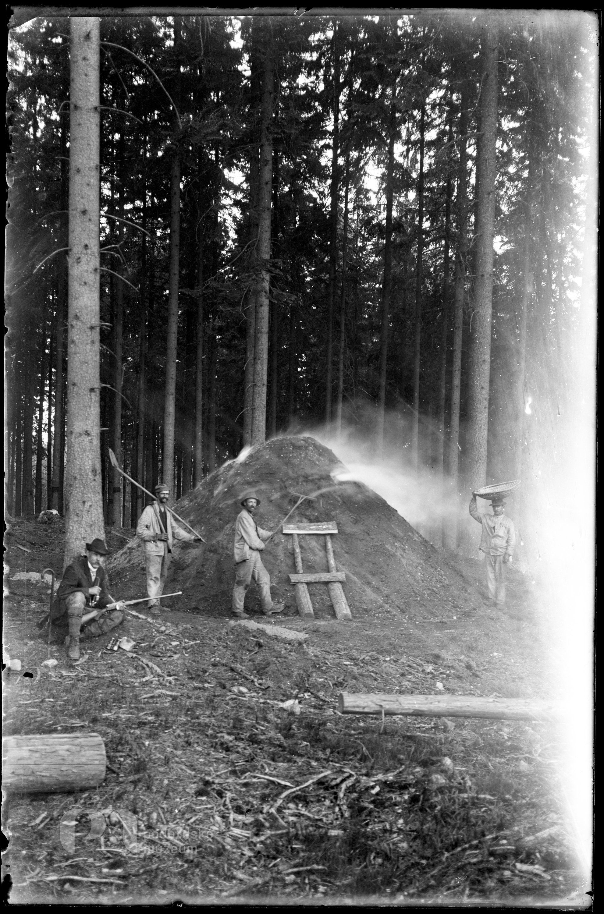 Opis ze staré obálky: Pálení dřev. uhlí v milíři