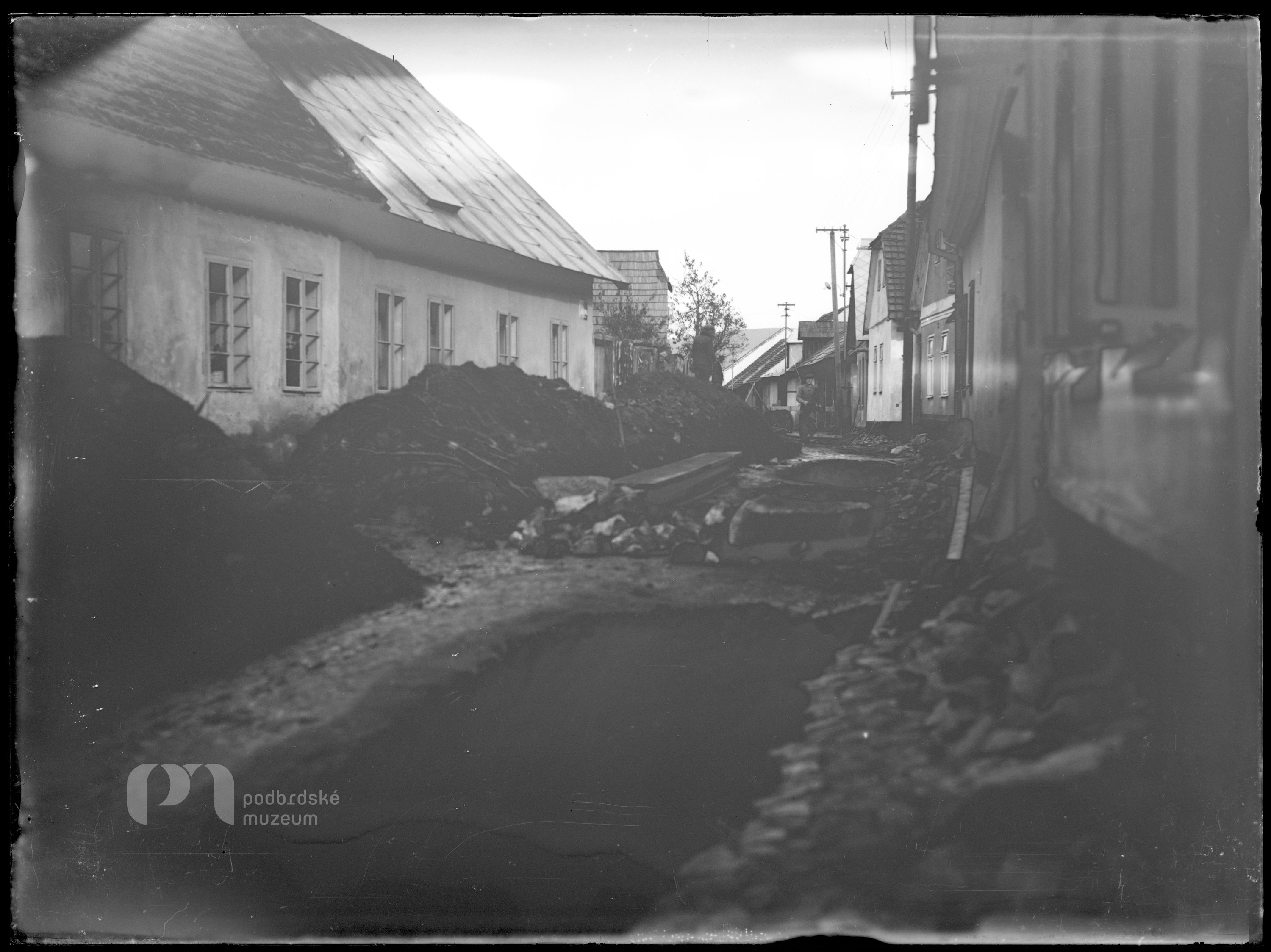 Opis ze staré obálky: Ulice od Jarešů k Mateřské školce. V zimě (vykopaný vodovod)