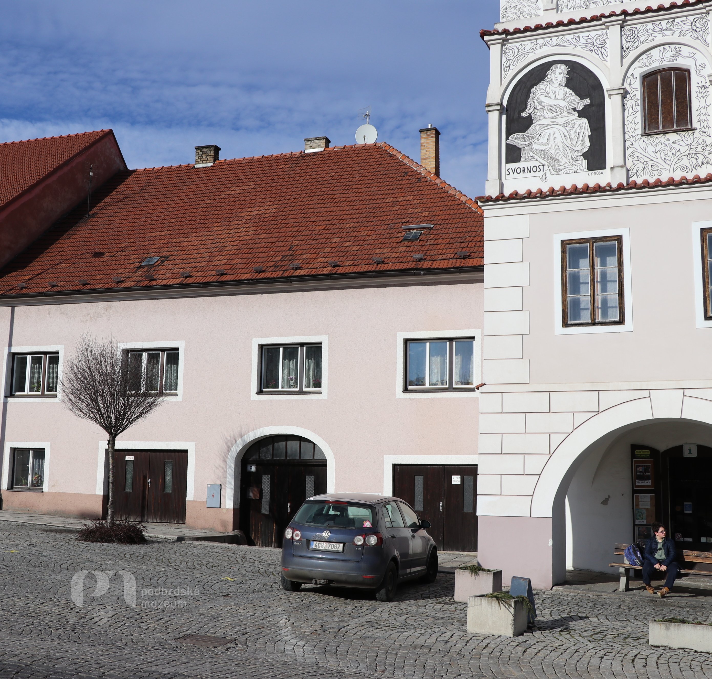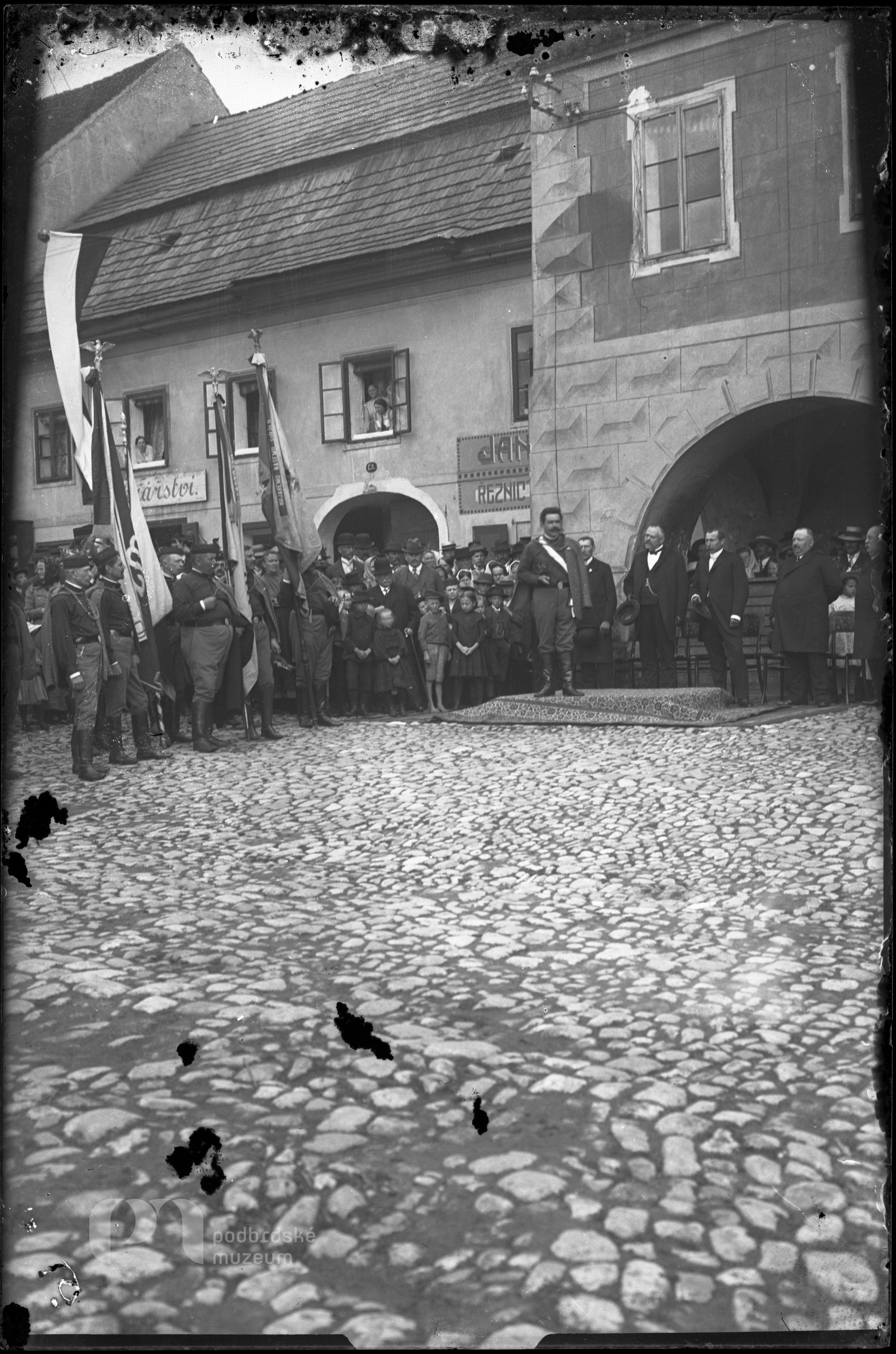 Poznámka: vyryto č. 6. Pozici fotografa určil Jan Pešta, Rožmitál p. Tř. Karel Skalický: župní slet ve Volyni, 20. července 1913 někdy dopoledne, přivítání sokolů před volyňskou radnicí, ten první sokol zcela vlevo je stoprocentně starosta volyňských sokolů Josef Fiala, ten řečnící s knírem Ladislav Melhuba, tehdy župní starosta, vedle něj vpravo pod obloukem starosta města Volyně Karel Kavalírek, zcela vpravo tajemník úřadu Antonín Denk.
