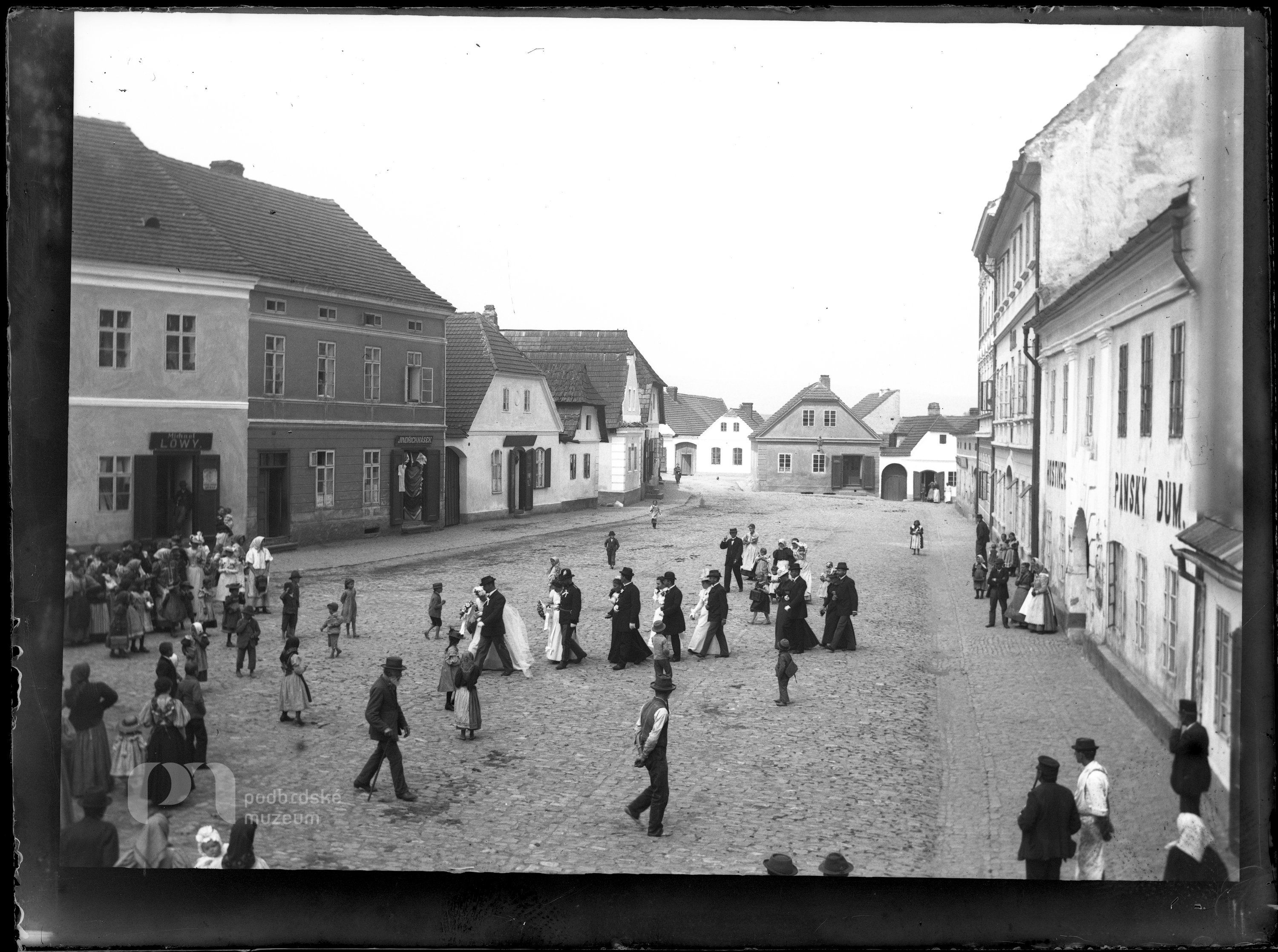 Opis ze staré obálky: Svatba vychází z Panského domu; šlo o dvě svatby: Dceru lesmistra Haschkeho Vilemínu s Fr. Blažkem a dceru lesmistra Haschkeho Marii s Romanem Rostem v roce: (jmenovaní jsou přeškrtnutí)