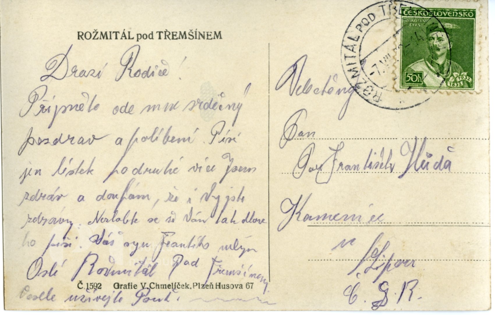 Poznámka: Č. 1592 Grafie V. Chmelíček, Plzeň Husova 67; prošlá poštou 7. VII. 1914