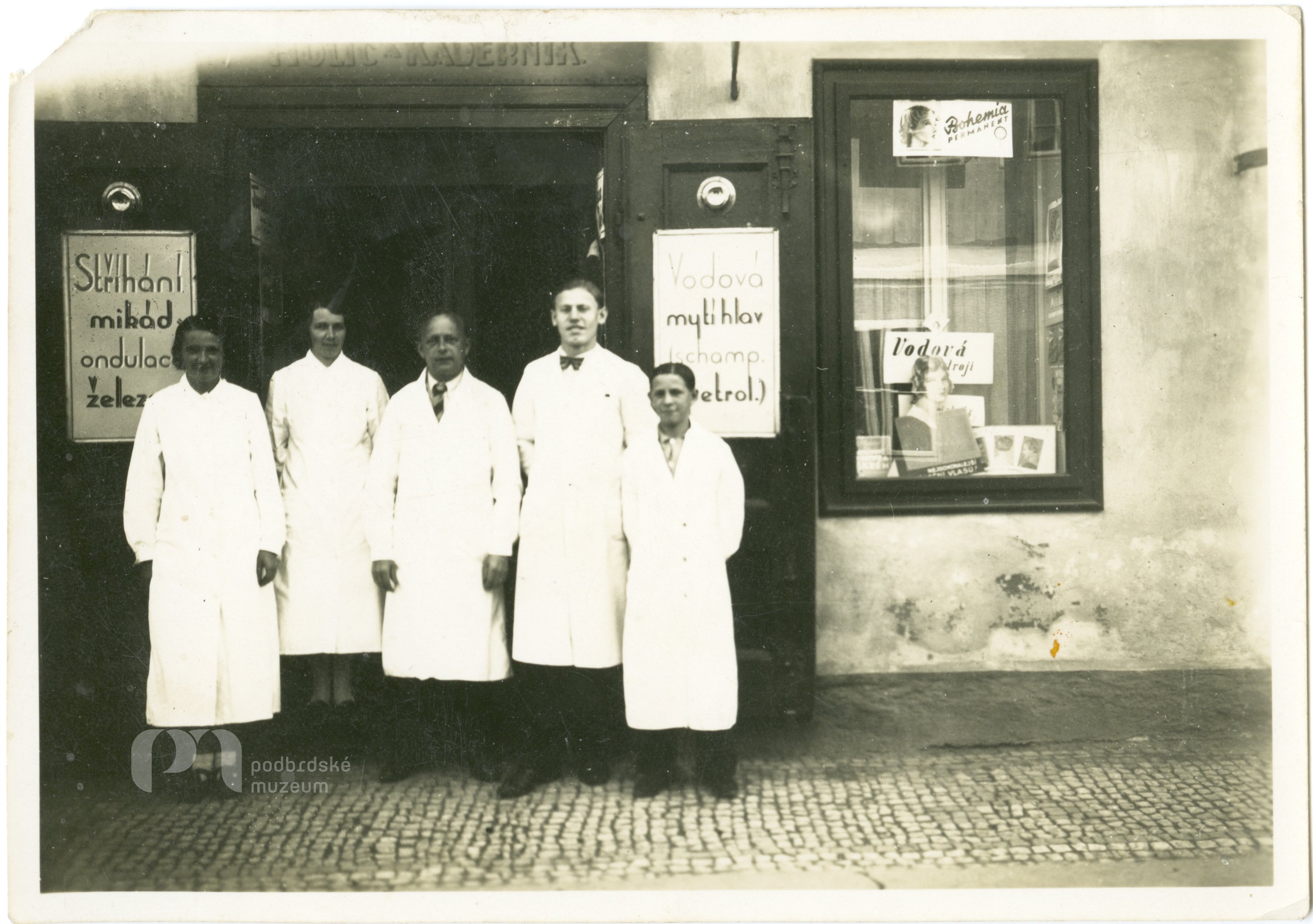 Václav Valenta se zaměstnanci před svým kadeřnictvím