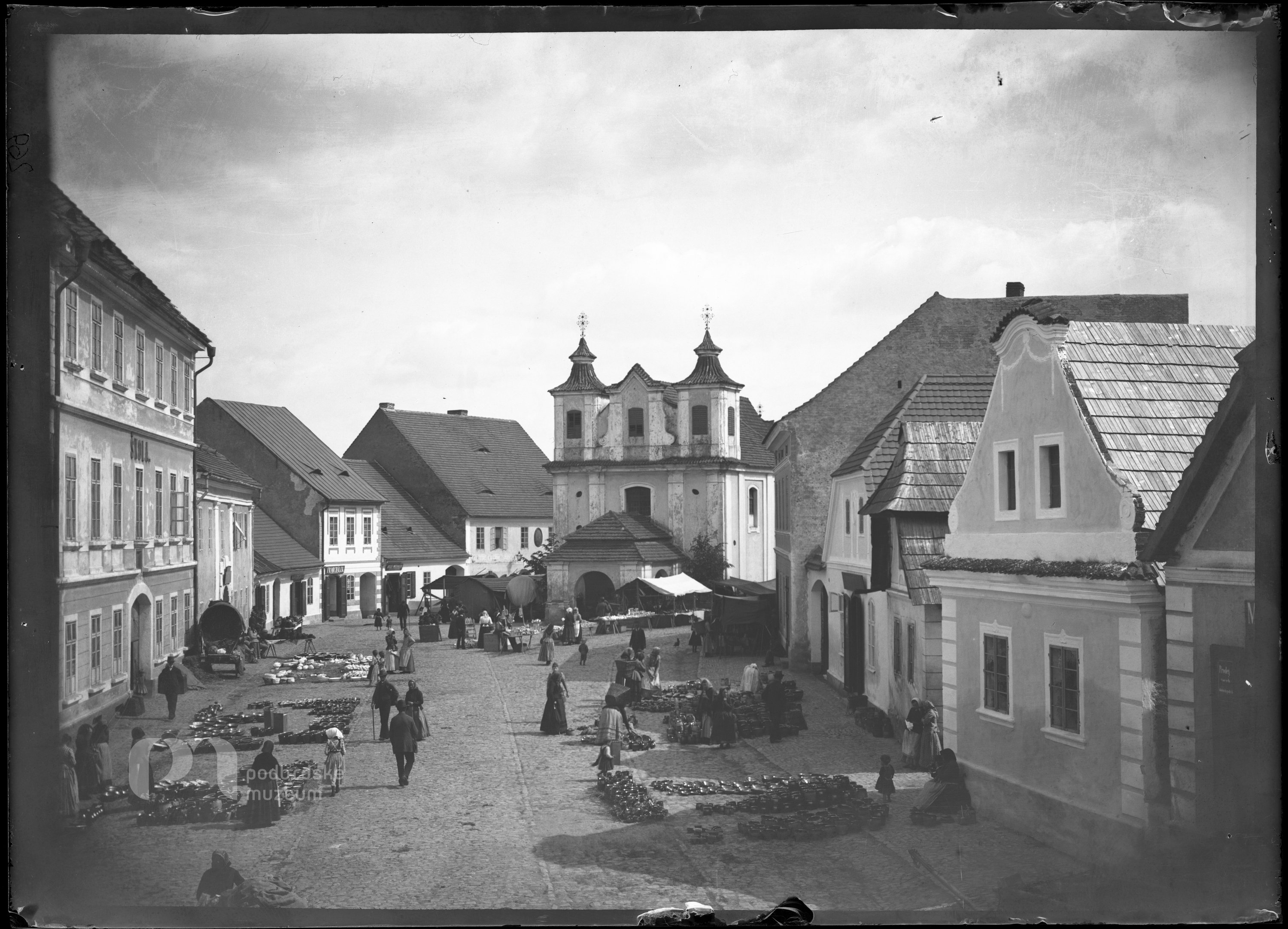 Opis ze staré obálky: Před "devátou" na náměstí 13. 8. 1893