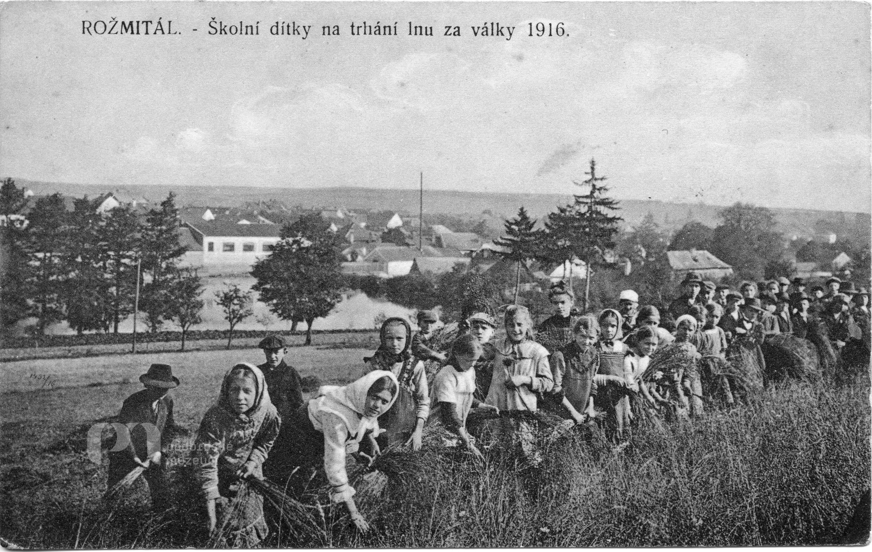 Školní dítky na trhání lnu za války 1916