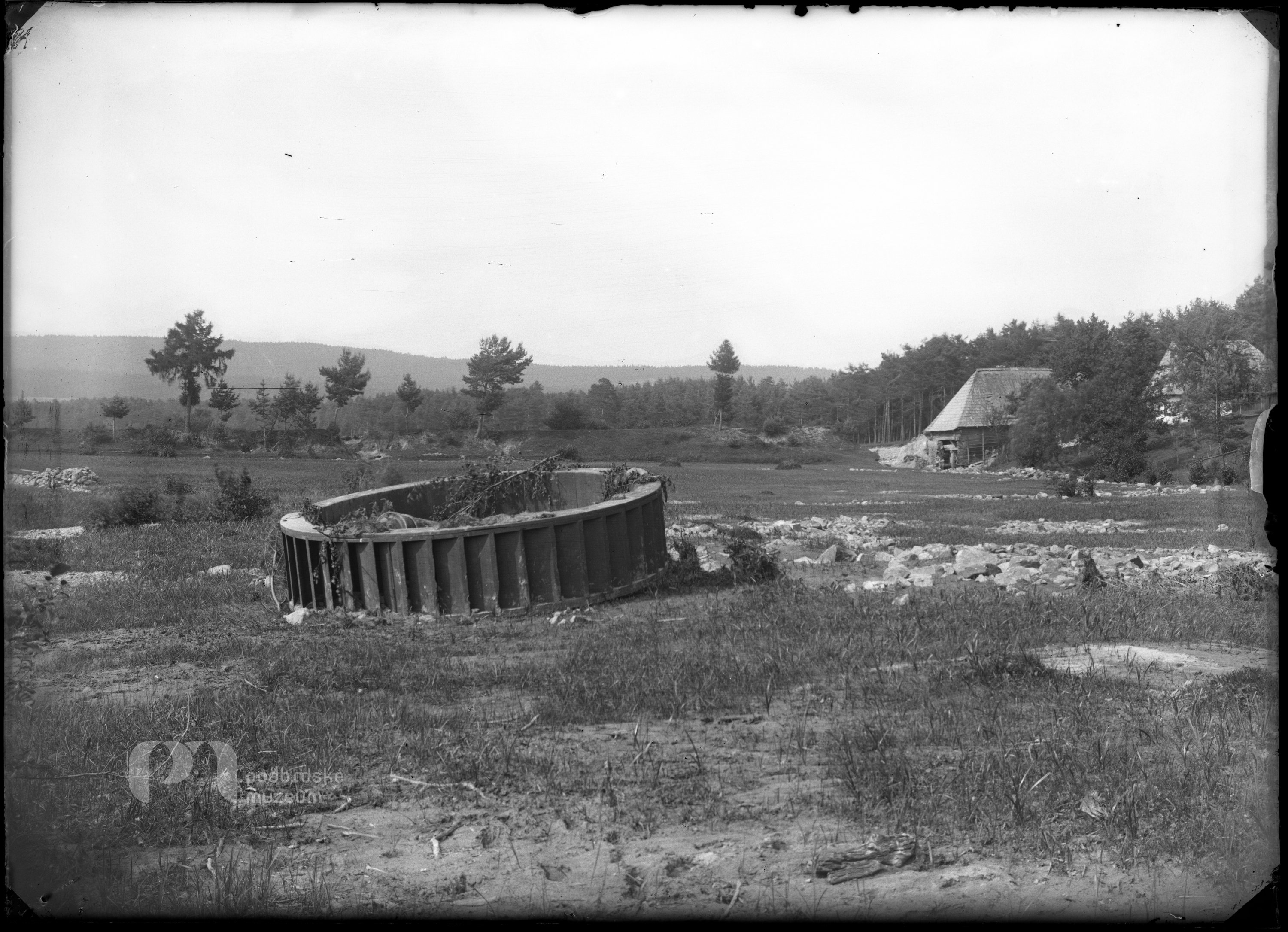 Opis ze staré obálky: Povodeň 1895 ; Odplavení mlýnského kola z mlýna Sobenského
