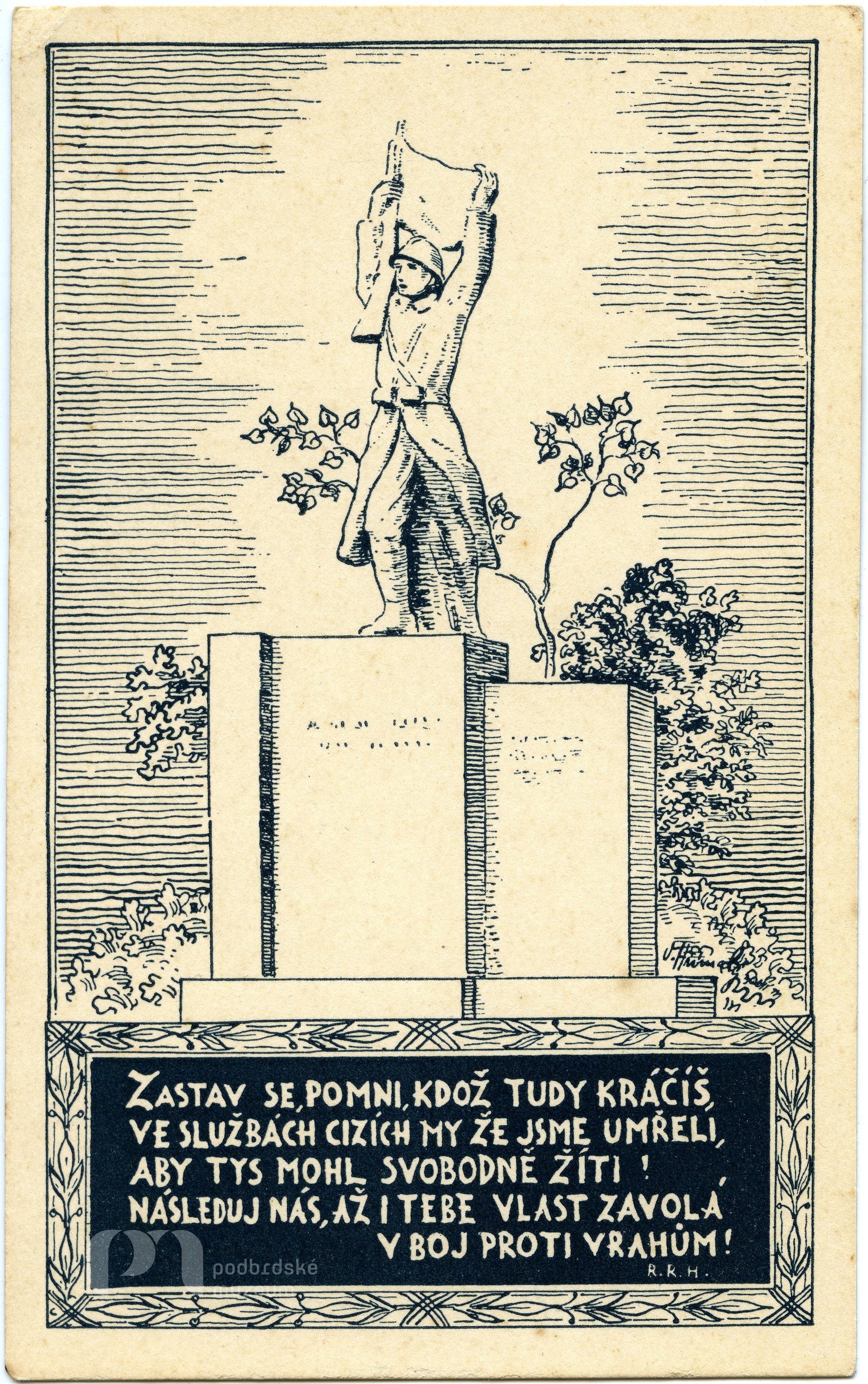 Poznámka: V. Hřímalý, nedatováno. Umělecká práce arch. Viléma Kvasničky a akad. sochaře Josef Bílka. - Ve prospěch pomníku rodákům Rožmitála pod Třemšínem, padlým ve světové válce. Neprošlá poštou