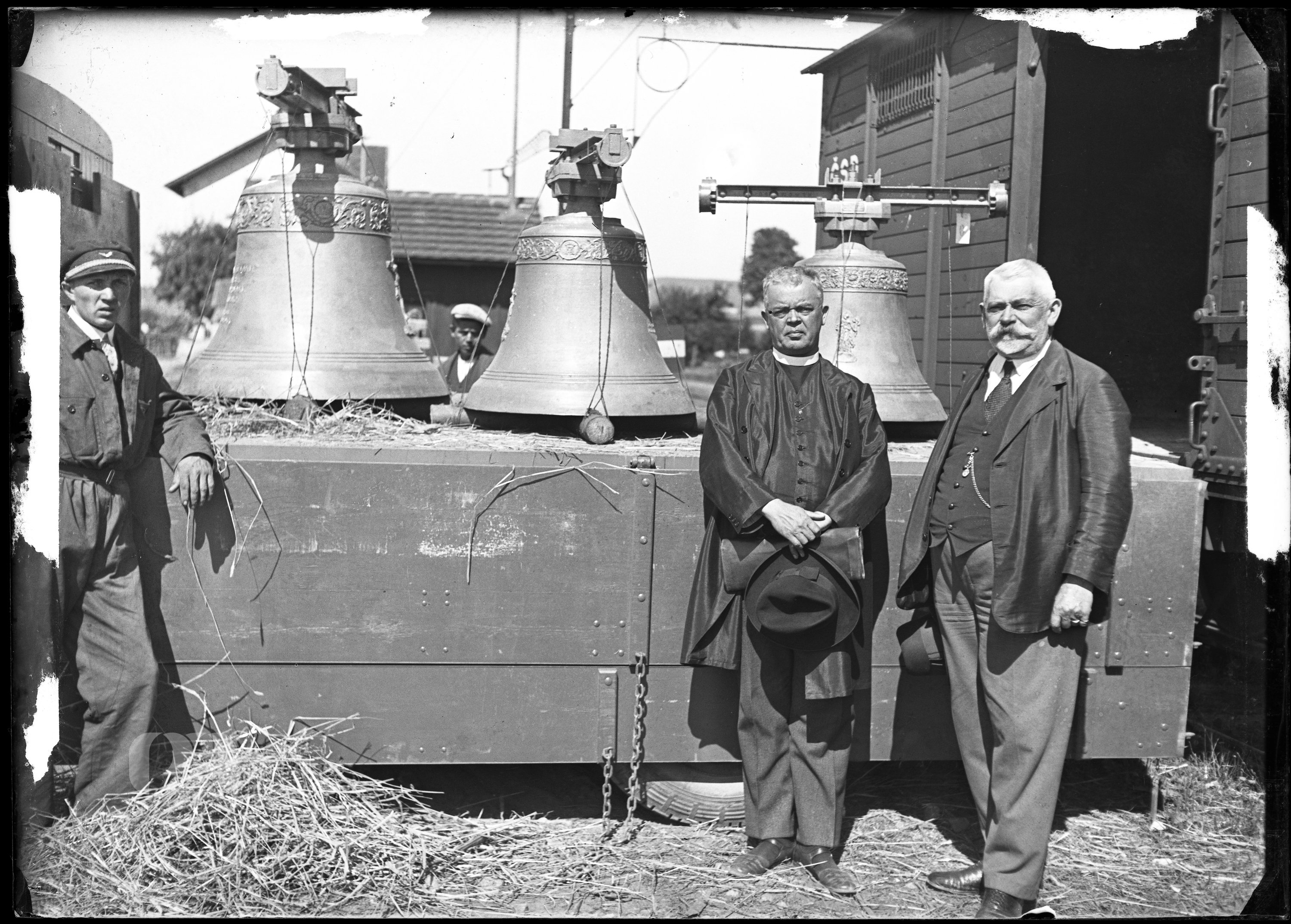 Opis ze staré obálky: Zvony pro farní kostel (1933), Lesmistr Ing. Fr. Blažek, farář P. Podhradský 2 ks