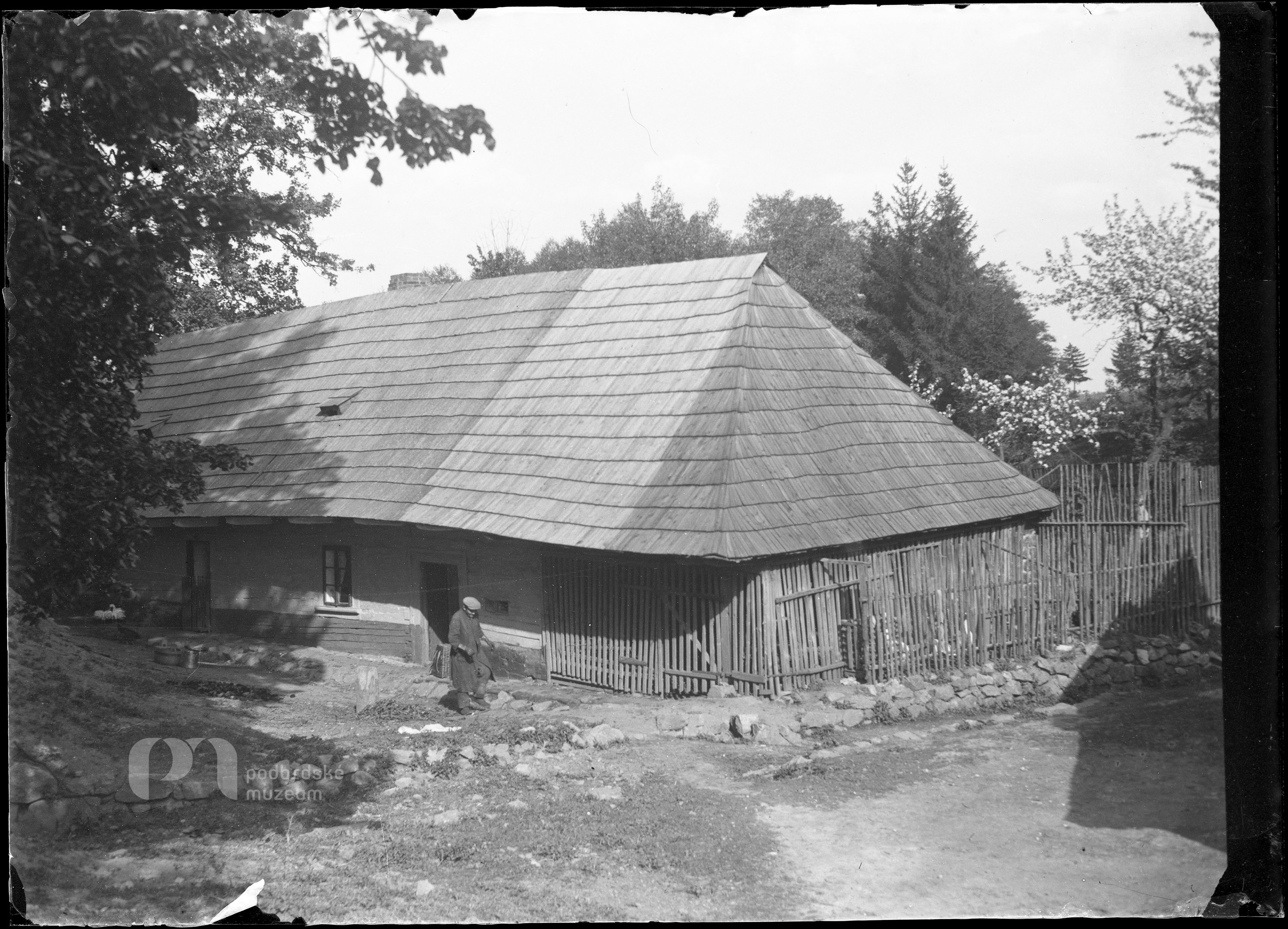 Opis ze staré obálky: Chalupa (?) Pod hrází podzámeckého rybníka u Dvora - napravo stála "požahovna" - naproti přes vodu špýchar. Za mých dětských let jsme jí říkali " Zoubkovna" M. H.